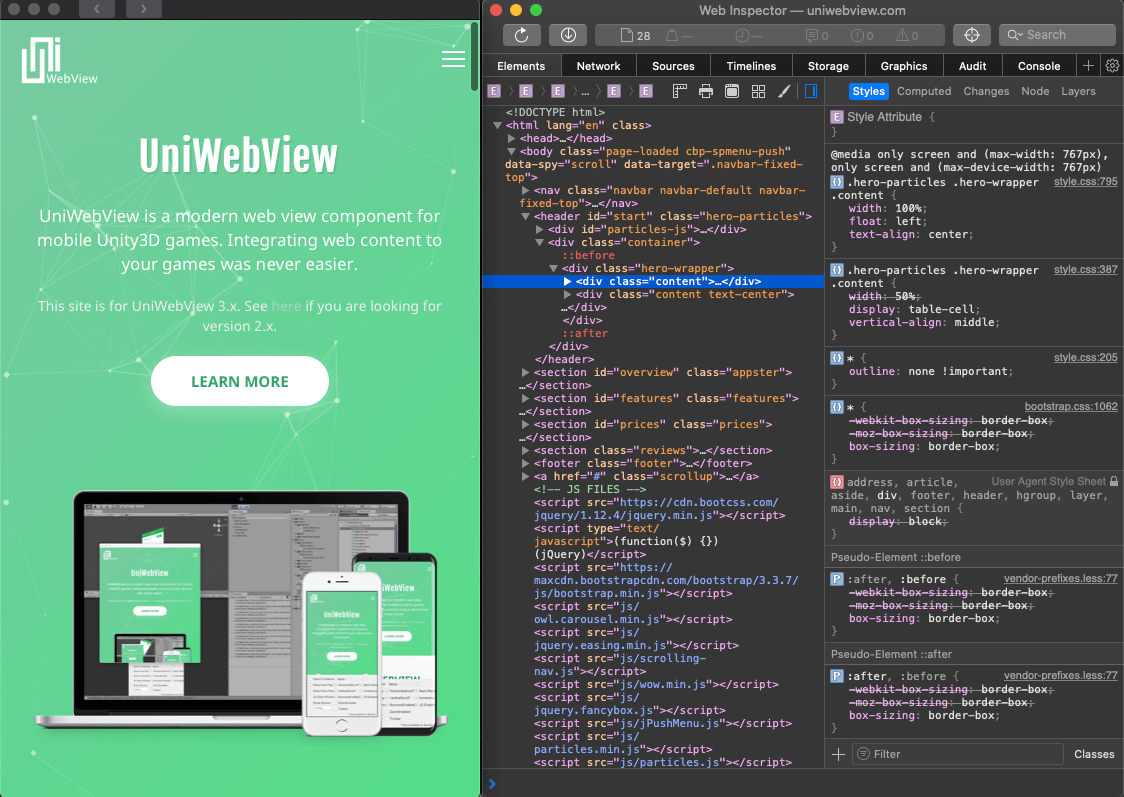 Sometimes, you need to inspect your web page, to modify some DOMs, stylesheets, or watching result of a JavaScript. UniWebView supports to inspect your page in a browser dev tool in Chrome or Safari.