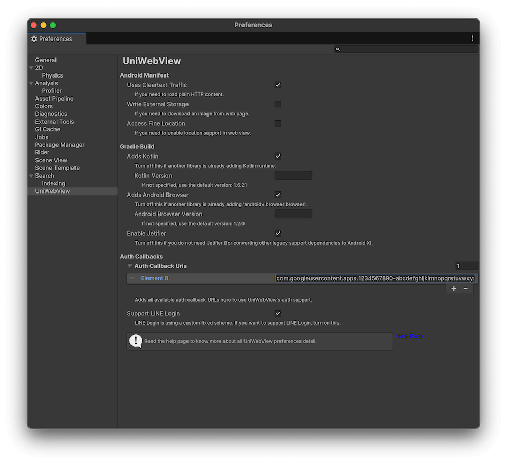 Open the preference panel (Unity → Preferences) and find UniWebView in the sidebar. Then, expand Auth Callbacks URLs and add the callback URL (com.googleusercontent.apps.1234567890-abcdefghijklmnopqrstuvwxyz:/auth