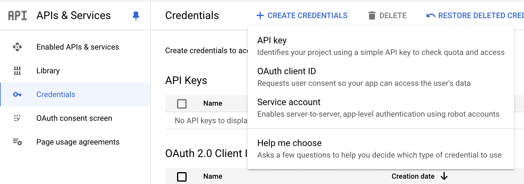 We assume that you already have a valid Google Cloud account for development. Navigate to your project on Google Cloud, click APIs & Services -> Credentials (or use this link). Then click Create Credentials and select OAuth client ID.