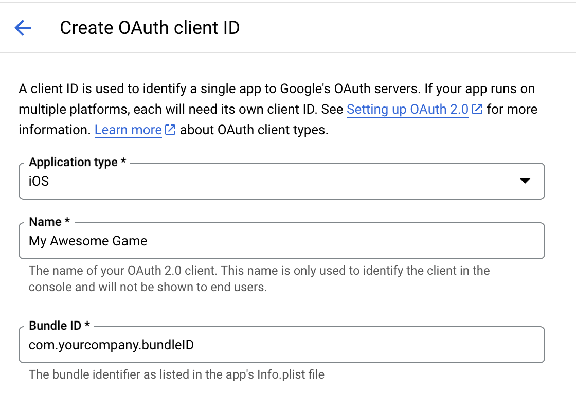 In the "Create OAuth client ID" window, choose iOS as the application type. Give a proper name to your application and fill in the bundle ID. You can leave all other fields empty for now. Click Create to generate an OAuth Client ID for your app.