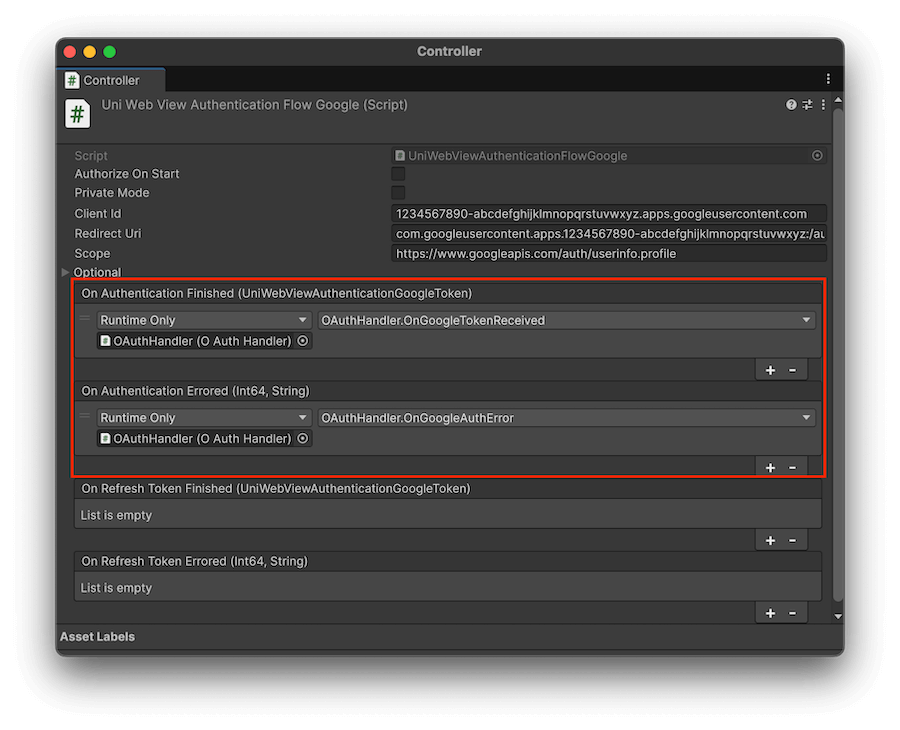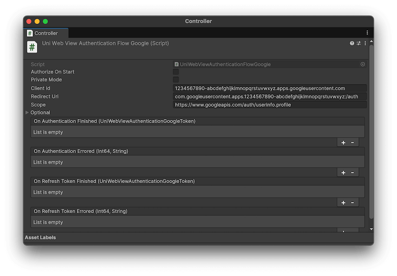 Next, fill in the necessary values for your app in the added UniWebViewAuthenticationFlowGoogle